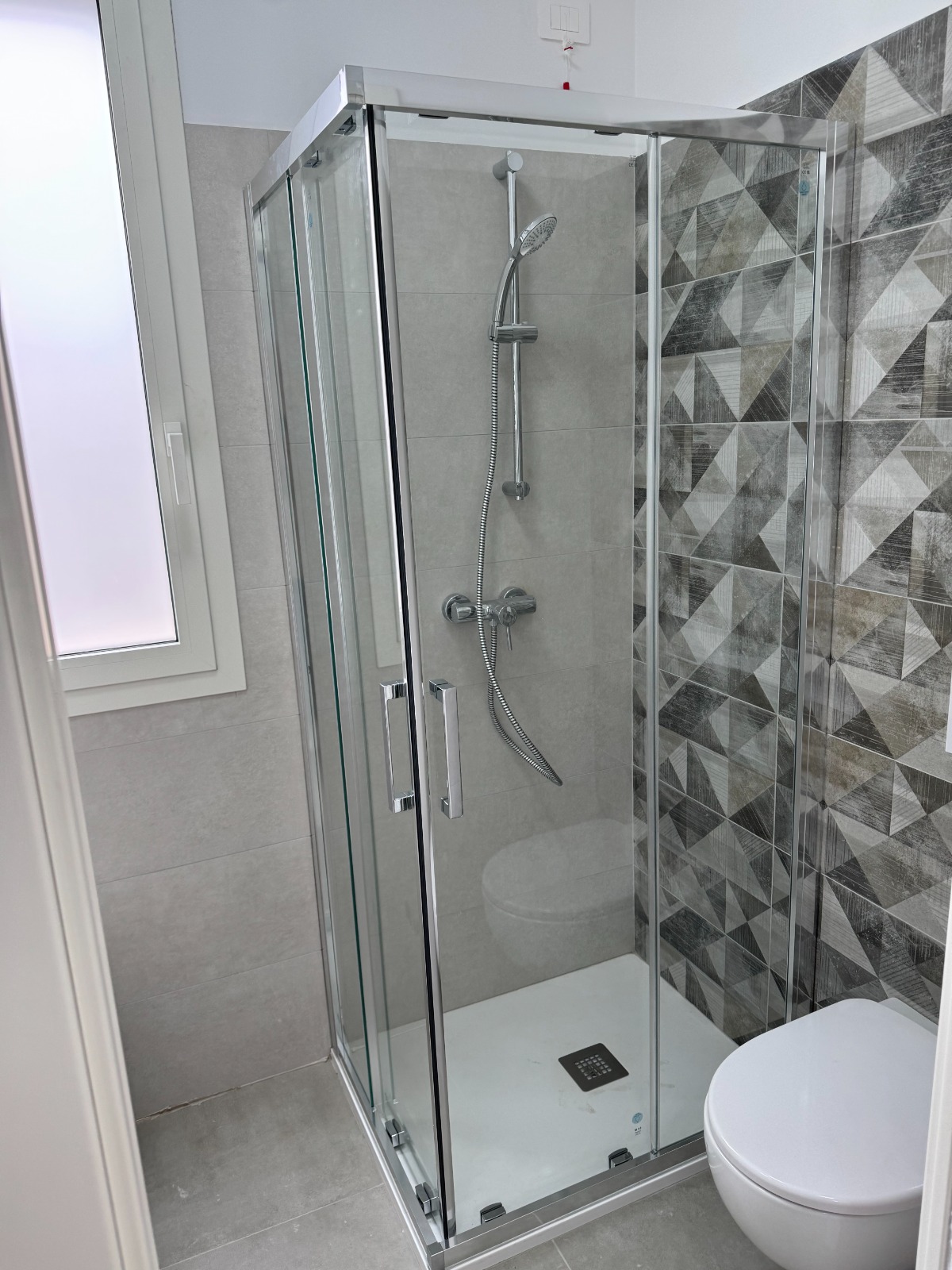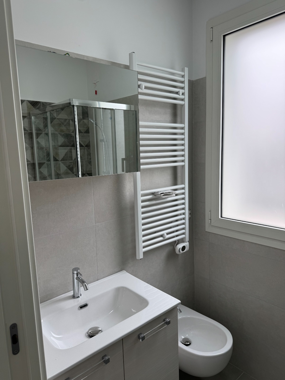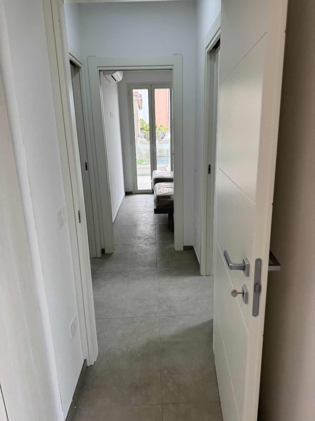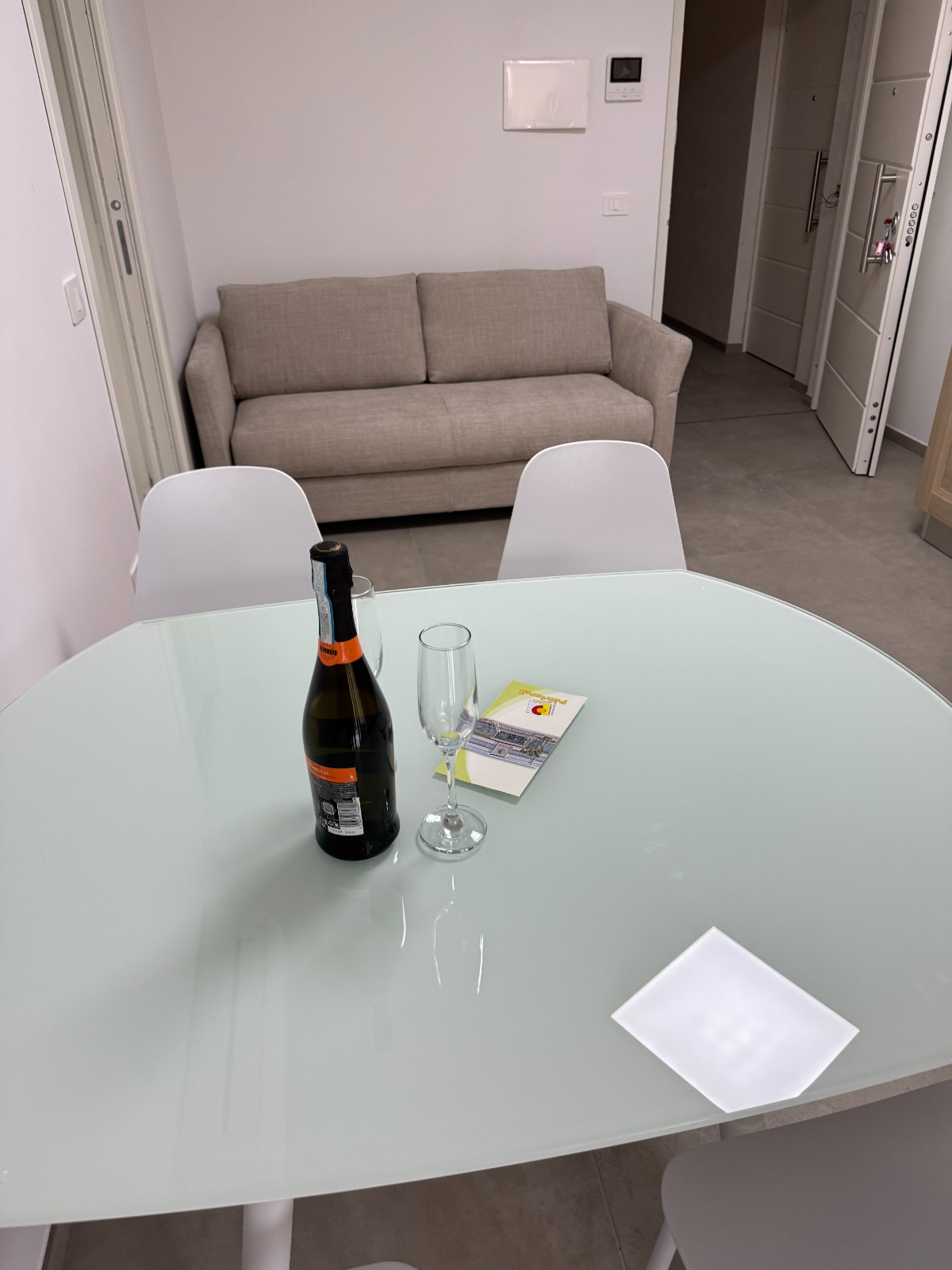 Appartamento al piano primo con ascensore con comodo balcone coperto, composto da soggiorno con cucina componibile attrezzata e divano letto, con uscita su comodo terrazzo con piccola vista mare laterale, disimpegno zona notte, una camera matrimoniale con uscita sul terrazzo di servizio con vaschetta e lavatrice, bagno con box doccia e finestra, seconda camera con due lettini a terra, dotato di tutti i comfort: lavatrice, tv, aria condizionata in tutti gli ambienti, lavastoviglie e possibilità di comodo garage privato.