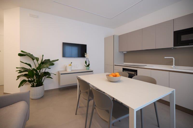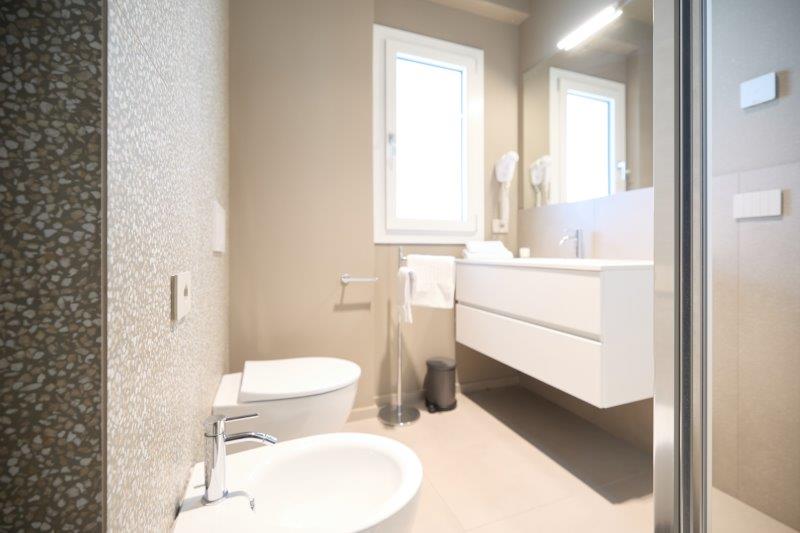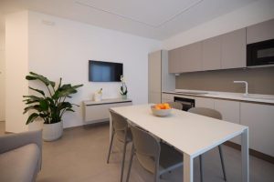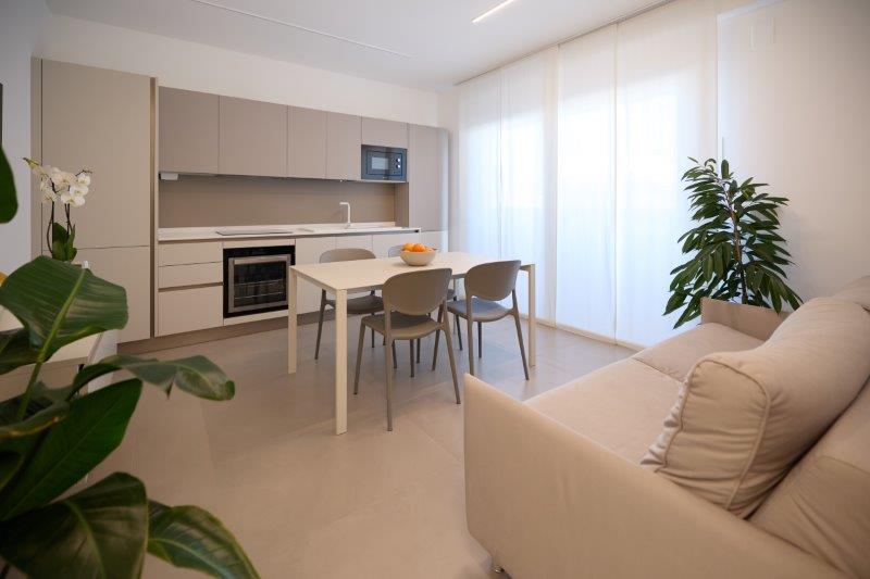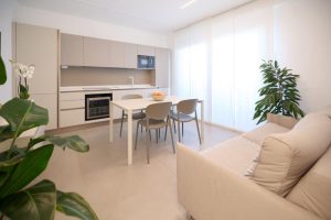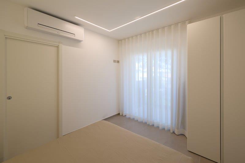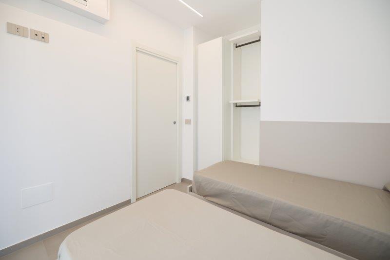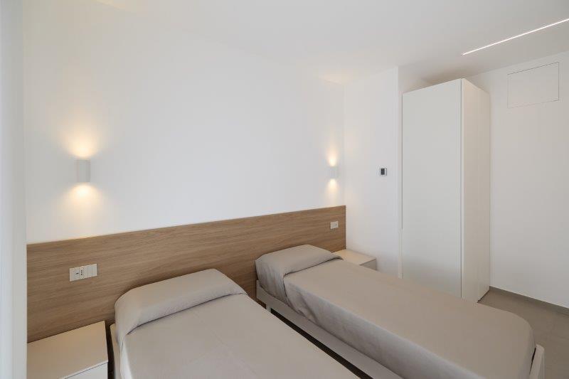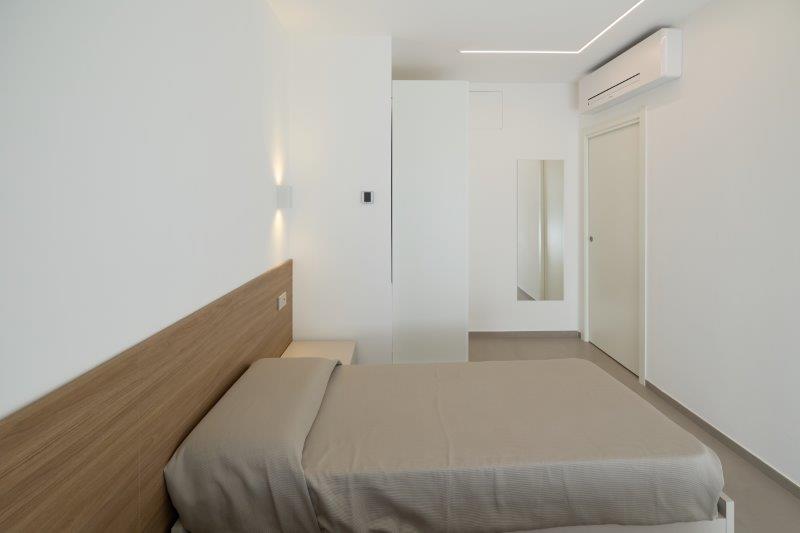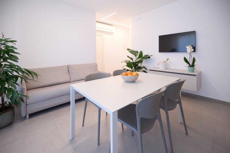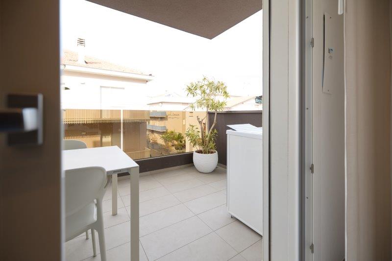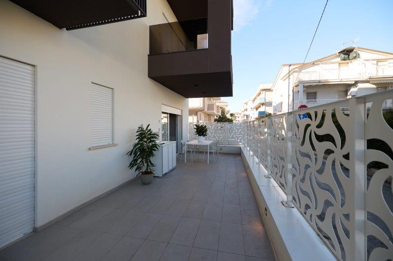 In palazzina nuova costruzione a pochi metri dal mare in zona pinete ad Alba Adriatica, eleganti appartamenti finemente arredati con ampi balconi e terrazzi attrezzati. Dotati di tutti i comfort: wi-fi, microonde, lavastoviglie, aria condizionata, lavatrice, tv lcd , rastrelliera bici e possibilità di posto auto al coperto. Tipo B-trilo con corte esterna. Ampio soggiorno e cucina attrezzata con divano letto e corte esterna , una camera matrimoniale, un bagno con box doccia e finestra, seconda camera con due lettini singoli a terra. Possibilità di aria condizionata e posto auto al coperto.